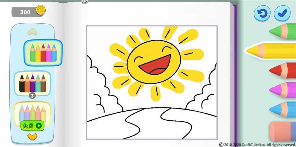 有没有看到《汤姆猫总动员》玩具箱中有一个画板?上面有很多画,需要你去获得并上色。今天就 为大家讲解太阳挂画怎么上色吧。首先第一步,我们要给主体太阳上色,太阳主要是用黄色和红色进行涂色,太阳表面用黄色,然后嘴巴部分用红色。边边等到天空上色之后,再去进行点缀。 第二步 ,要给边上的草丛进行上色,草丛很简单,就是用绿色。 第三步,给地面上色,需要用到第二套铅笔,用那条稍偏银绿色的上除那条小路以外的地面,