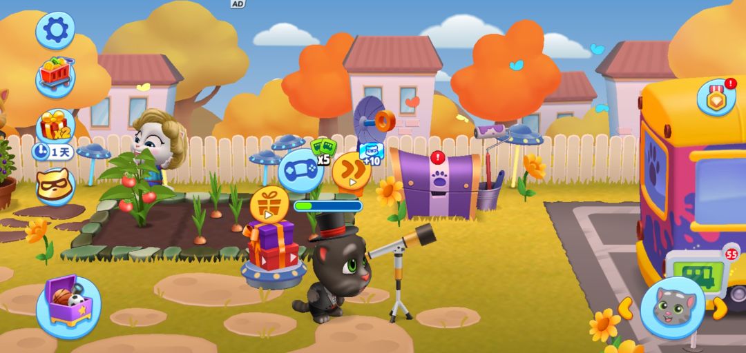 相信大家也注意到了,在汤姆猫家族的房子里面,还有一个特别调皮的扫地机器人,上面还坐着一个大礼包,经常在家里溜达,从花园到前门,到处都有它的影子,不得不说就连礼包车也像宠物们一样调皮好动。那么这个礼包车在游戏中会发挥什么样的作用呢?那今天就来给大家介绍一下。 我们点击礼品车,可以进入到转盘的界面。观看一个简短的视频就可以进行抽奖啦。转盘里面有金币,巴士币,卡包,玩具和家具,还藏有神秘的惊喜大奖哦,