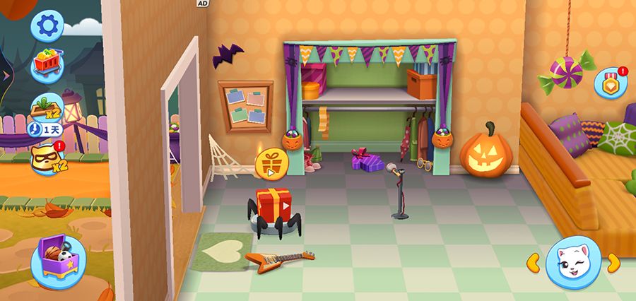 虽然万圣节已经过去几天,但是《汤姆猫总动员》游戏里还是一派万圣节的场景哦!而在这万圣节主题的场景装饰中,可是隐藏着不少有趣的小彩蛋,会根据小伙伴们的动作做出相应的互动!如果大家之前都没有留意,那今天就一起来看看吧! 1.可以点亮的南瓜灯 作为万圣节的必备元素之一,南瓜灯摆饰必不可少!而《汤姆猫总动员》游戏里的南瓜灯摆饰平时都是暗着的,但是如果小伙伴们点两下,南瓜灯就会亮起来哦! 2.会飞的魔法扫