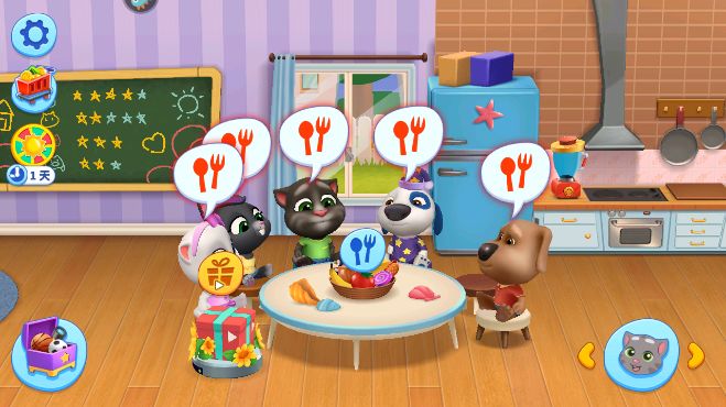 回到《汤姆猫总动员》的大房子中,我们将会迎来新的一天,引入眼帘的总是成群结队的宠物饿着肚子想要吃的。因此,我们每天的第一件事,就是带着宠物们围着饭桌入座,制作精美的早饭,满足这群小可爱们贪婪的肚子。 游戏中的食物还是非常多样的,而且价格也很便宜。但是因为宠物多,我们在食物上的花销也会比较大,因此在日常的游戏中我们需要多多积累金币,购买足够多的食物应急。食物可以从饭桌后面的冰箱中进行购买,而我们的
