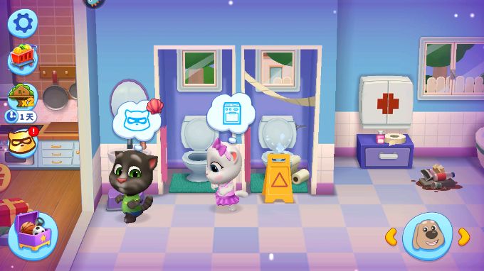 《汤姆猫总动员》汇集了汤姆猫、汉克狗、安吉拉、狗狗本、金杰猫以及贝卡兔这六位会说话的汤姆猫家族的小成员,他们生活在一间大房子里,像我们一样,要吃饭睡觉,也要学习玩耍;同样地,他们也需要上厕所,甚至生病要打针吃药。小伙伴们要给予关怀照料,他们才能一直健康快乐地成长! 那么我们完成了吃饭,上厕所,洗澡等等的操作后,宠物们都会有想做的事情,我们可以查看它们头上的气泡了解,比如玩玩具,踩滑板,打游戏等等