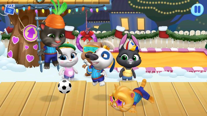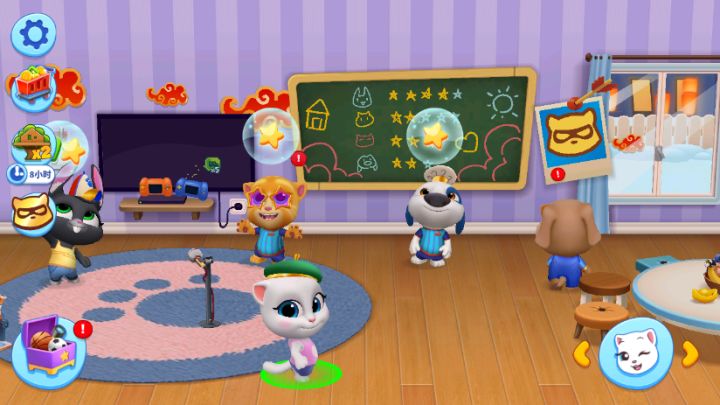 《汤姆猫总动员》汇集了汤姆猫、汉克狗、安吉拉、狗狗本、金杰猫以及贝卡兔这六位会说话的汤姆猫家族的小成员,他们生活在一间大房子里,像我们一样,要吃饭睡觉,也要学习玩耍;同样地,他们也需要上厕所,甚至生病要打针吃药。小伙伴们要给予关怀照料,他们才能一直健康快乐地成长! 不知道大家有没有留意到客厅黑板上的小红点呢?我们点击进去可以看到几只宠物以及星星的收集程度。其实我们每次满足宠物的需求的同时,收集的
