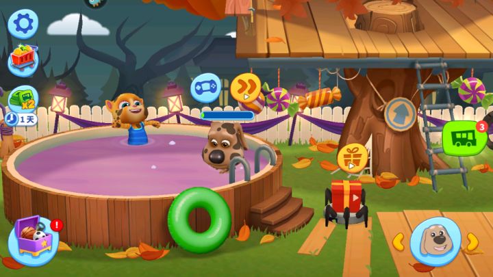 随着十月的来临,汤姆猫家族也与我们一起逐渐步入了秋天的世界里,一改夏日酷暑的环境,院子已经是铺满了金黄色的树叶,显得特别有秋日氛围。趁着初秋的到来,快带着汤姆猫家族到院子中玩耍一下吧! 不知道大家有没有发现,除了秋天的装饰更新外,还加入了很多万圣节的元素呢?紫黄色的搭配,浴缸和水池里面清澈的水在我们不经意间变成了魔法药水。围墙外夏日的气息早已被神秘的丛林小屋代替了。而且在汤姆猫的家里,还挂满了万