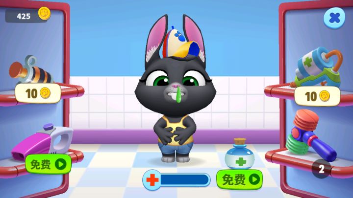 《汤姆猫总动员》游戏中宠物们有一个公寓,我们可以给它装扮浴室、厨房、客厅、前院、后院五个地方。空间环境确实还是比较大的,也适合多位汤姆猫成员们居住。因为有多只宠物的存在,所以也会在日常的生活中出现各种各样的意外,当宠物受伤或者生病的时候该用什么医疗道具呢? 如图,当宠物流鼻涕的时候,我们可以使用左下角的吸风机帮助宠物吸干流出来的鼻涕,当宠物头晕的时候,用气锤敲一敲宠物就会立刻好转,同时也会触发一