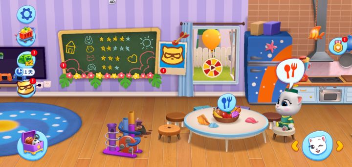 《汤姆猫总动员》是一款休闲手游,精美绝伦的游戏世界,3D的效果呈现出来更加精彩,里面物品都超级萌!我们在游戏中可以照顾非常多的虚拟宠物,感受不同的汤姆猫家族成员给我们带来的快乐。同时,游戏中也有反派角色罗伊,抓住罗伊,解锁通行证可以获得大量的奖励。那么积分转盘在哪里呢?在客厅的黑板旁,有个用气球绑着浮空的转盘,我们可以点击进去。通过观看视频启动转盘,我们可以非常快速地获取积分解锁奖励哦。