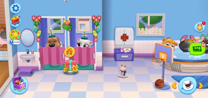 回到汤姆猫的公寓里,发现汤姆猫家族的宠物们在我们不在的时间里玩耍的不亦乐乎,身上都是肮脏的一片。果然养宠物的麻烦事还是挺多的,还好我们是“云养”的模式,不需要真的拎着一只又一只的宠物去洗白白。那么碰到一群小宠物都需要洗澡的时候该怎么办呢?它们洗的慢,留着其它宠物在旁边看着,我们也着急。那这里告诉大家一个隐藏的小技巧。除了大浴缸,旁边的梳妆镜也是可以洗漱的哦!不知道大家有没有发现呢?小伙伴们还有没