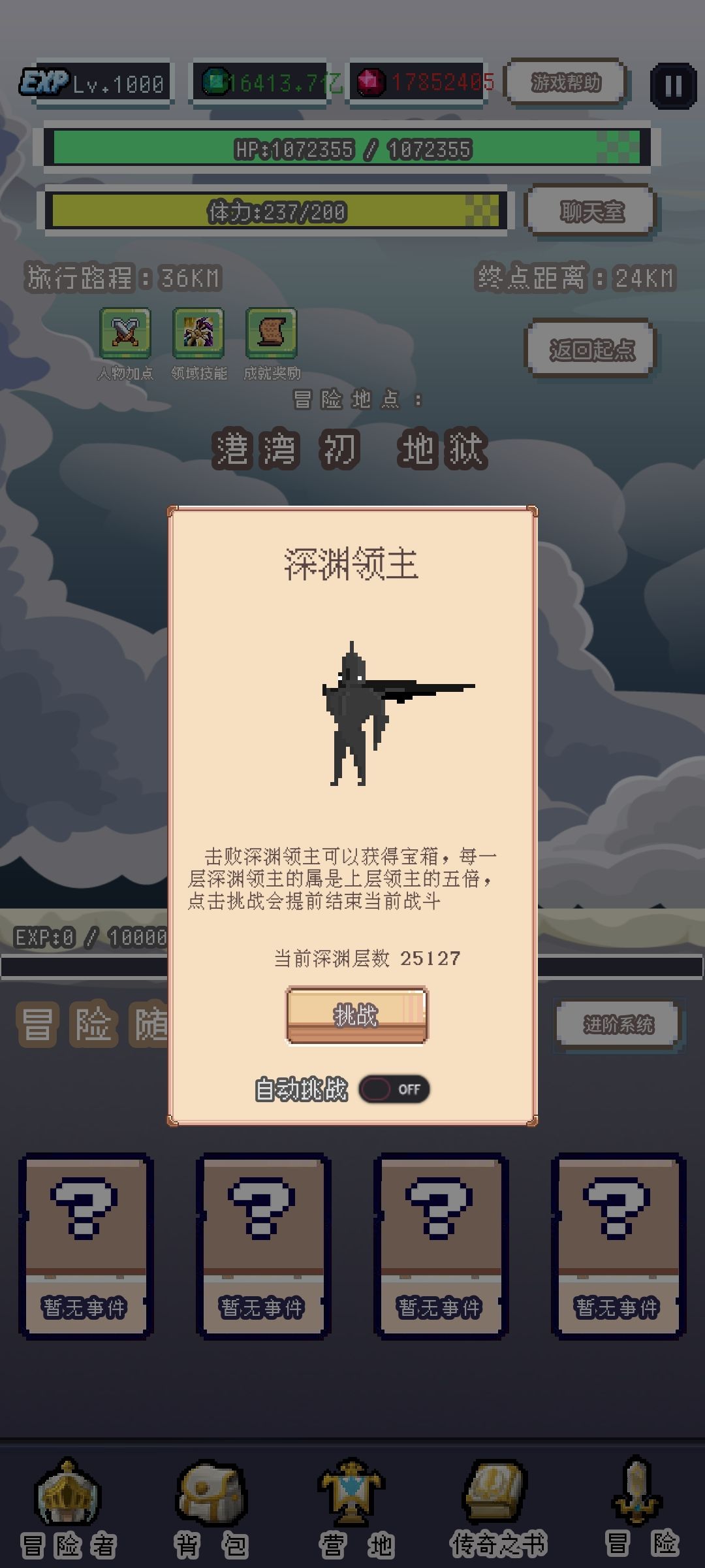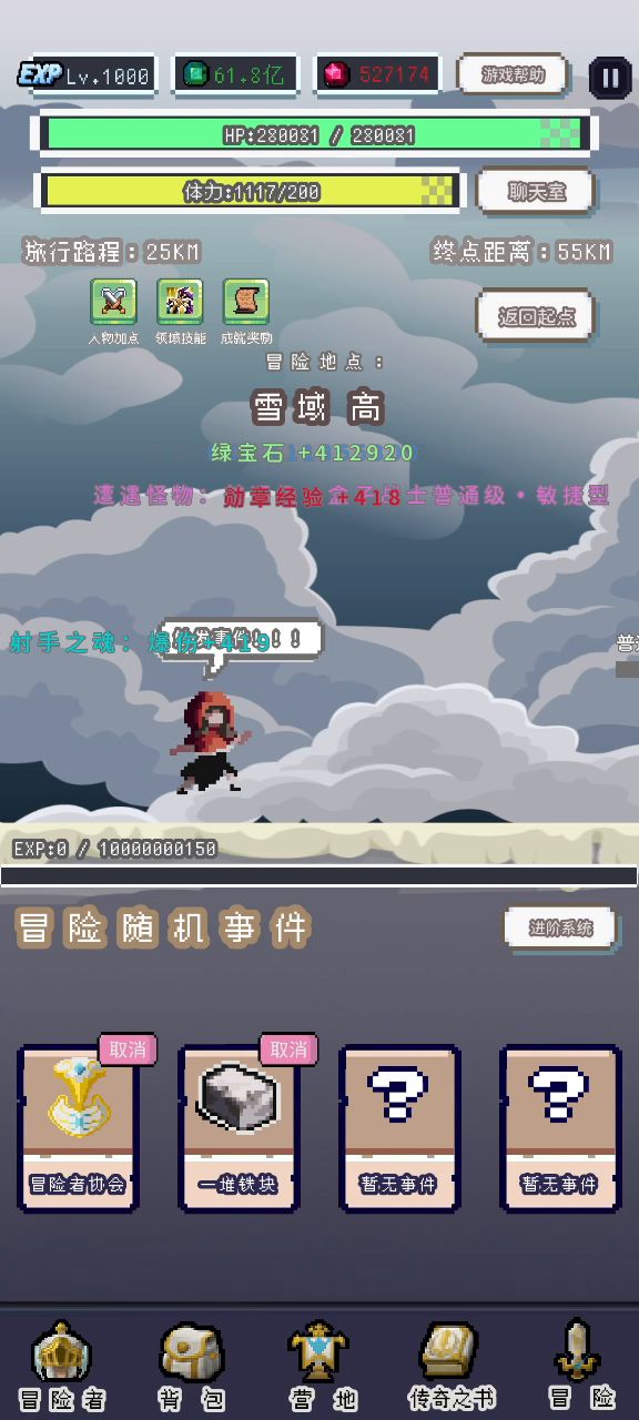 其中带“※”为特殊玩法 1.技能机制 (1)技能 <1>技能点机制 打完任何一个地图boss给三个技能点,技能点无上限。 ※ <2>刷技能点 进阶系统→挂机设置→关了“击败领书自动前往下一关”→冒险者→云端山脉。 <3>学习技能 冒险者可在冒险者协会学习技能。 (2)勋章机制 勋章可在冒险者界面查看,勋章等级越高,能带的技能越多,最高为传说级冒险者,最多为9个。勋章经验打怪获得(地图怪),