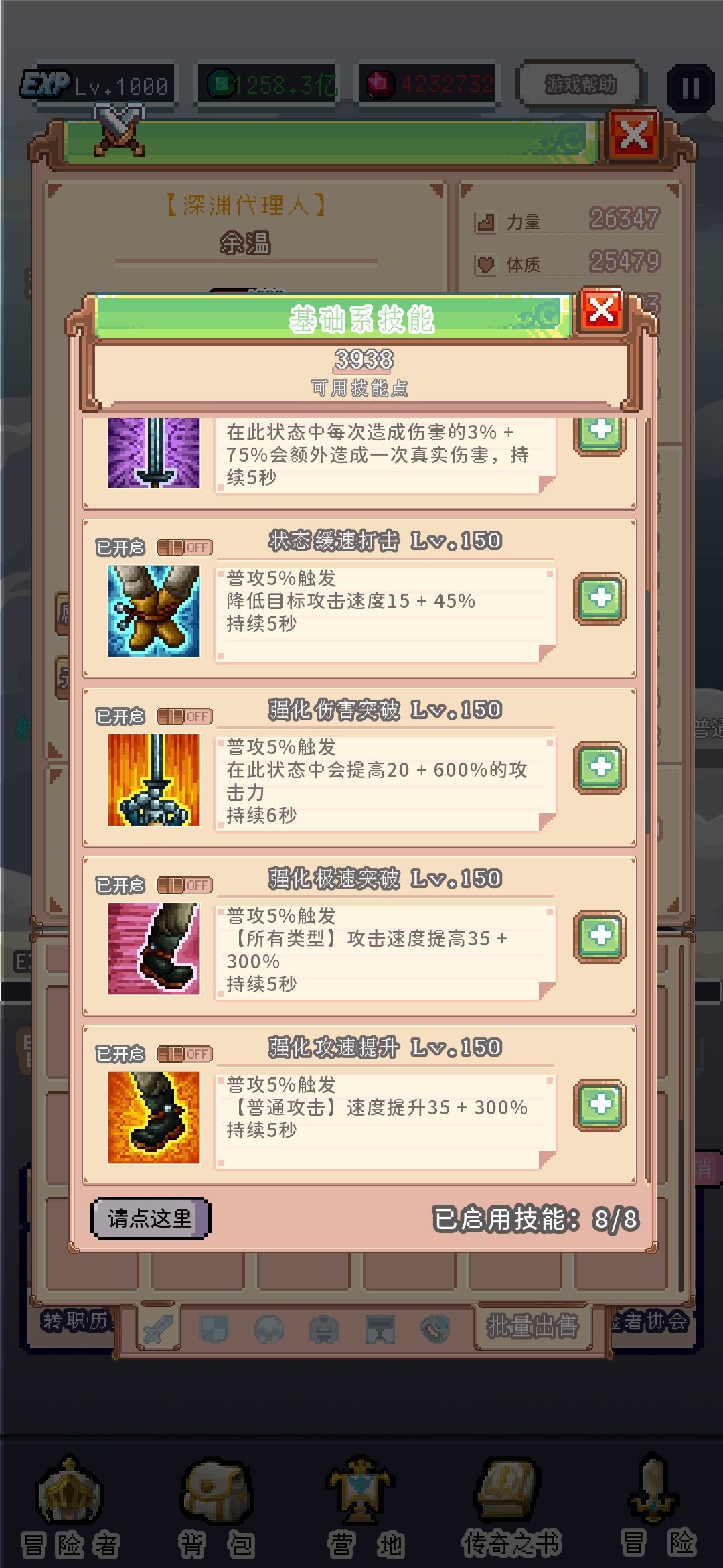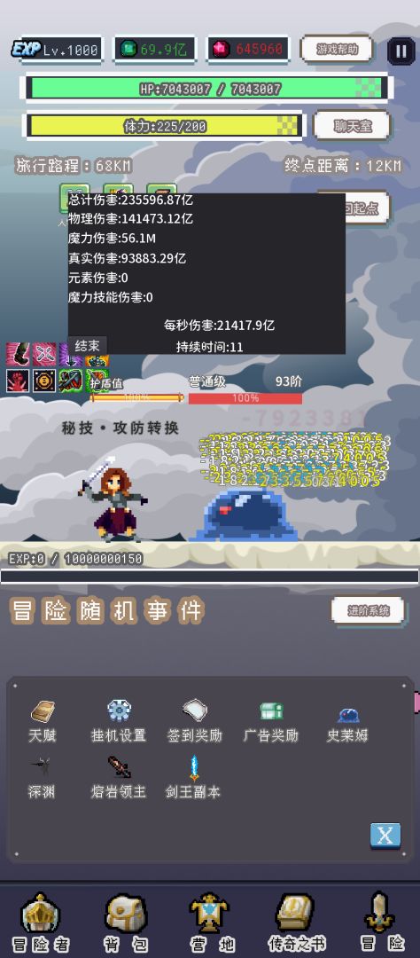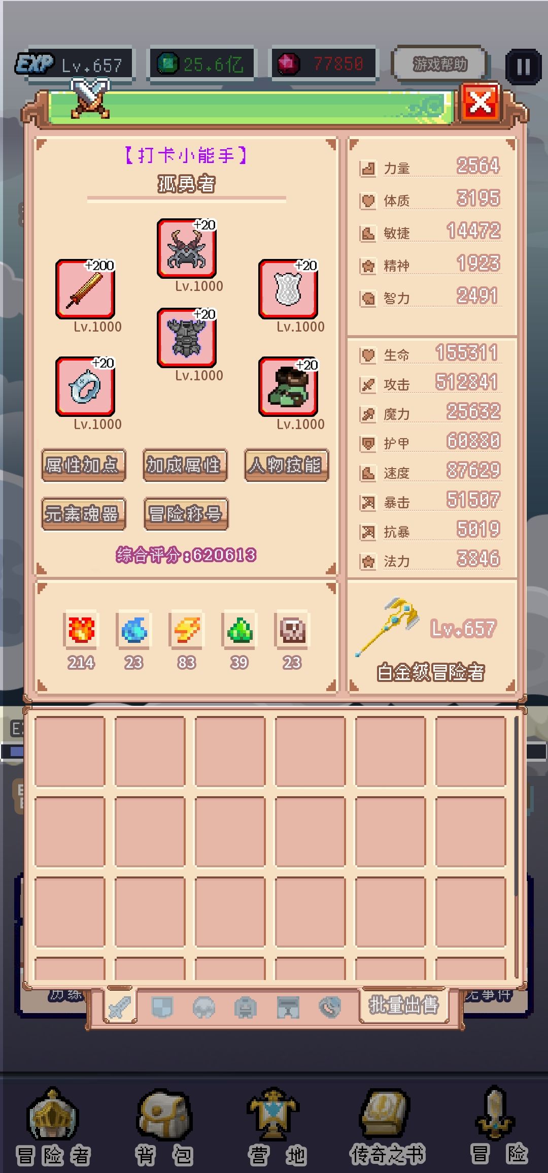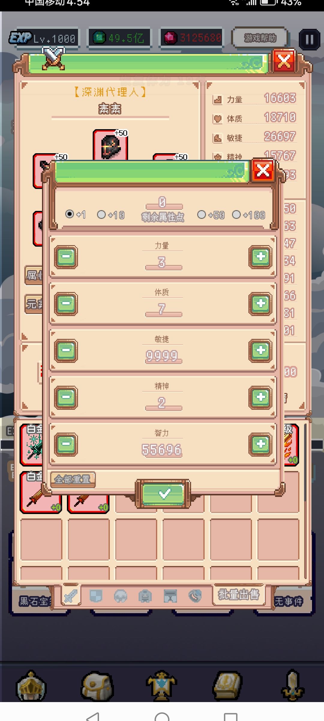 新人建议 1.开局加点不要加基础属性,最好选择幸运或者锻造 (因为力量敏捷可以升级加点,后者反之) 2.这是一款挂机游戏,所以为了挂机你需要把营地里面的主城等级升满,主城的作用就是按时间给经验 (我现在133级升级需要938w,主城每分钟给我47w) 3.神级晶石最好是在高等级的时候用 (打装备是根据人物等级多少打的装备就是多少) 4.属性点前期选敏捷,后期不怎么靠属性点,敏捷可以高速触发事件效果
