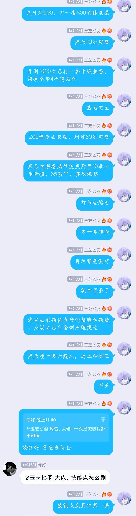 新手必看 前期如何快速升级。 目前我就只做到了5小时 3次重生30次突破, 我是23.30开始开号,进去选人加点必须全加幸运,第一时间签到在把广告刷完,在领兑换码,领完就传奇之书里面把三个属性全买了,期间可以开领地,10分钟左右领地的所有建筑都能满级,除了庄园之外,庄园我到现在都还没有升级,之后在存领悟点买领域技能里面的属性点, 前期领悟点就买这上面, 500级的时候在领取右上角的奖励,这样领出来的装备都是500级的不换啥等级带上就可以了,带完看自己还差什么装备随便打造带上就可以了,每样装备随便洗几下能出舒服最好, 然后就等1000级领了武器在打造装备 鞋子副手都要打造出加自己主属性的。 领的武器强化200,装备都带上之后就重生。开始洗装备属性, 这时候历练是一次就能突破,在第一个1000之前最好边等边刷突破需要的书,刷满30本就可以了, 这里有个bug就是存一个冒险者协会可以一直用,等遇见历练的时候马上点,它就会先历练,历练完,你就点突破,突破完不用关,等他在遇到历练的时候你还能点突破。 第二次1000次的时候可以刷150层深渊,刷完领1w领悟点学技能在刷白金的熔岩。 然后我也才摸索到这个阶段, 不过我感觉先突破在重生时间应该会用的更少一点, 我的是先重生在突破的。