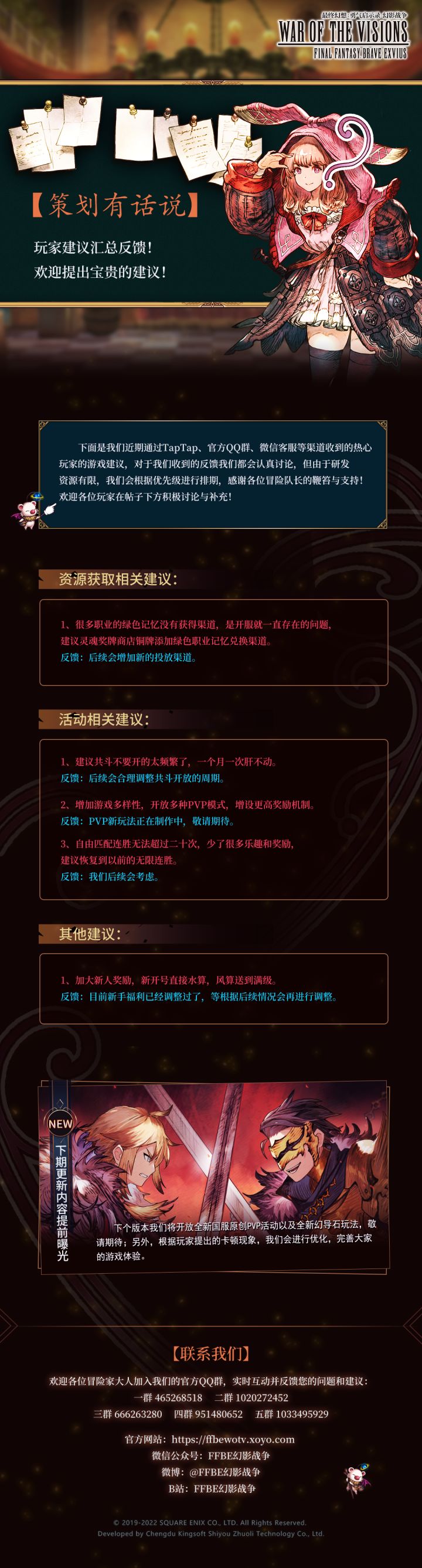 大家好:我是《最终幻想:勇气启示录 幻影战争》的策划羊羊(由于目前Tap社区无法修改昵称和头像,还请大家见谅),主要负责游戏版本内的系统策划。最近无论是TapTap还是QQ群,我们项目组都收到了很多热心玩家给出的建议,在这里羊羊替项目组成员向大家表示衷心的感谢。由于我们游戏是从国外引进,本地化改良的过程受到诸多因素的影响和限制,因此游戏中可能会存在某些不完善的地方,还请各位多多在帖子下方留言