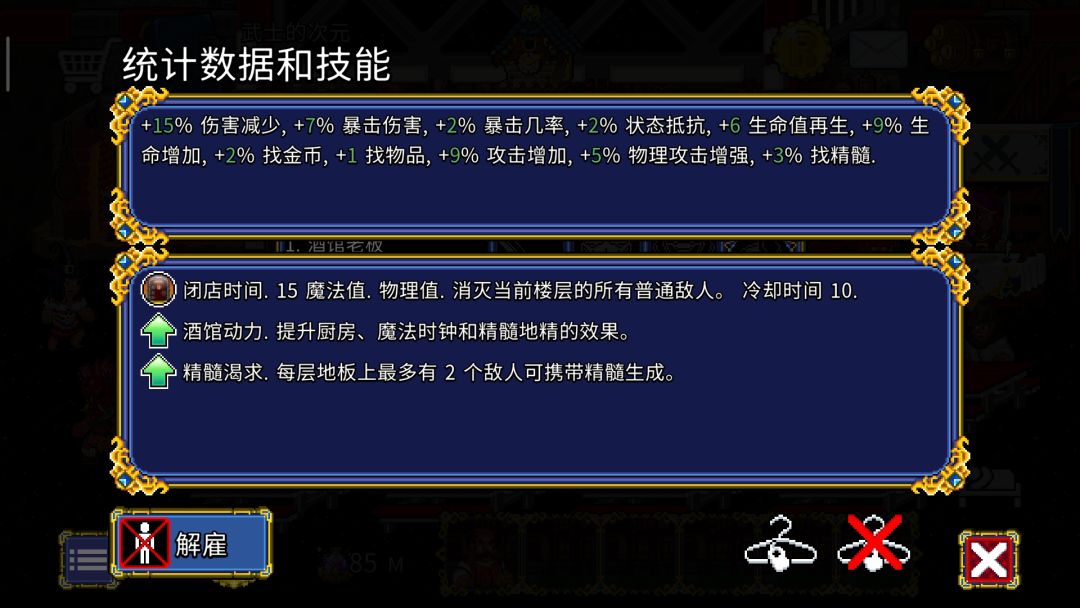 增加新角色,没有任何新的玩法,但是做了很多优化。 一、新角色:酒馆老板 定位割草无双的辅助角色,可携带双饰品,队伍中只能携带一个。 属性(50级): 闭店时间:物理伤害,秒杀该层所有小怪。等级为小boss以上的目标无效,冷却10回合。 动画为召唤一个巨大的正在关闭的木门往怪堆上拍,并引发震动。 酒馆动力:提升酒馆升级效果"厨房"、"魔法时钟"和"精髓地精"的效果。实测精髓地精的收益提升了10%(整