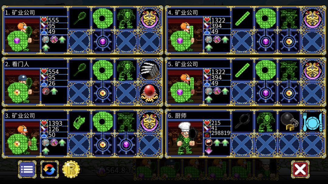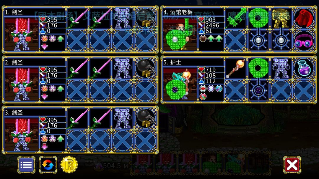 话不多说,先上队伍。 这个队伍大致的构想就是靠镰刀秒杀普通怪,剩下一个先用护士回血,再用玻璃剑收割最后一个。 5目标的层数(整万层)由于boss速度快,由暗黑之王先手收割boss。 7目标的层数(河流、沼泽)由酒馆老板直接A掉。女猎人降低冷却以确保每次都能用上。 所有人必须确保100%以上的状态抵抗。 1号位必选暗黑之王。原始地界(2世界)双目标的偷袭必定会有一个点1号位,然后再点其他人。暗黑之王