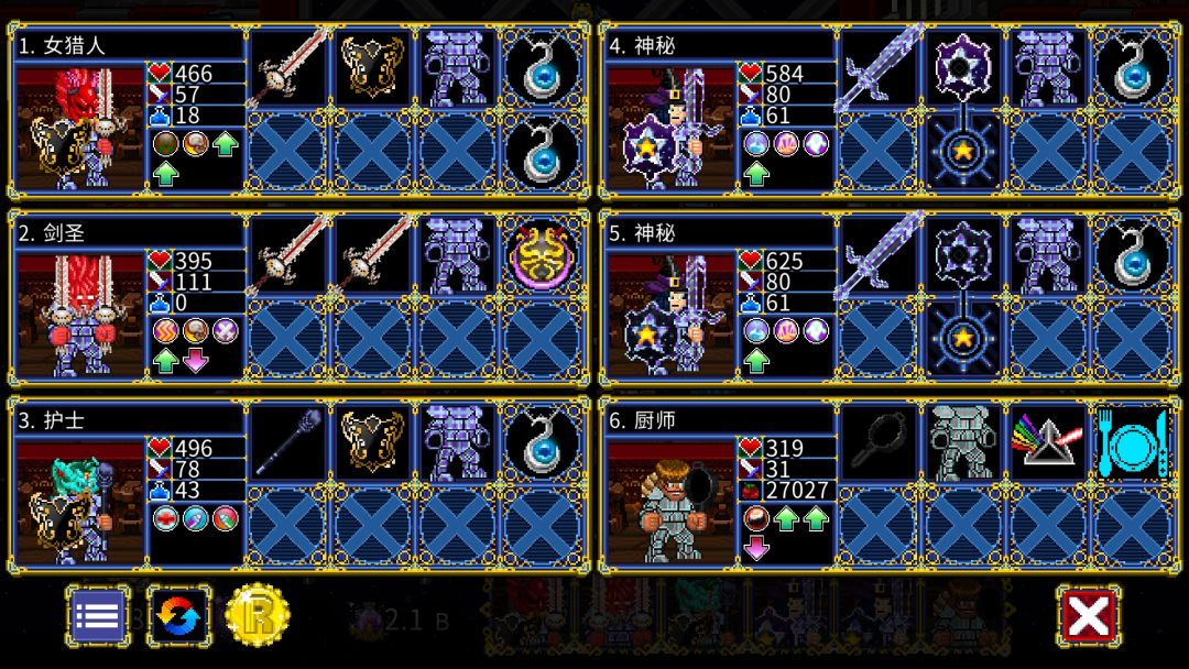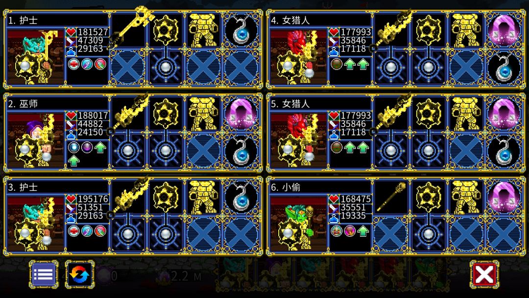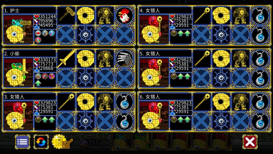 这个游戏对精髓的需求永远是第一的,即便到了1.09,这个趋势也没有改变。 精髓的获取除了直接打怪,还有可以用金币换取(后期竞技场收益可以忽略不计) 以推进87万层的视角,介绍一下我现在的队伍。 队伍两护士两猎人加巫师盗贼。装备清一色镀金(镀层是1.09新增的系统)以最大化金币收益。 在条件允许的情况下适当堆一些减伤,以解决被秒的问题。 黑暗魔王虽然有保命,但是带着他就会亏15个点的金币收益(1件镀