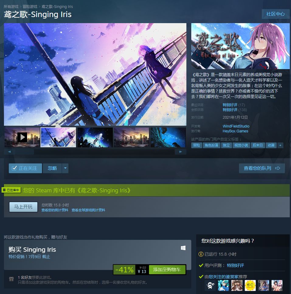 《鸢之歌》夏促打折了!打折了!打折了! 现在史低价只要13元哟,还没有冲的小伙伴可以趁这段时间冲起!有了游戏的小伙伴也可以安利别朋友来支持一下我们喔!