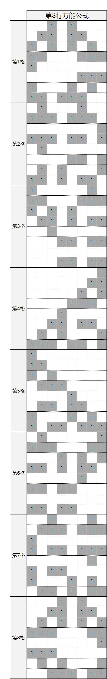 备注:大写数字一:上数第一行第一格大写数字二:上数第一行第二格小写数字1:下数第一行第1格小写数字2:下数第一行第2格依次类推。(以下结论适用于8×8图)点击一,然后从上数第二行开始消除尽第一行黑格,点击第三行用以消除尽第二行黑格,依次类推,消除尽前七行黑格,第八行剩下第5个黑格,无法消除。再仅点击二,可得到第八行第4格和第6格。然后点击三、四、五......(略)最终可以得到