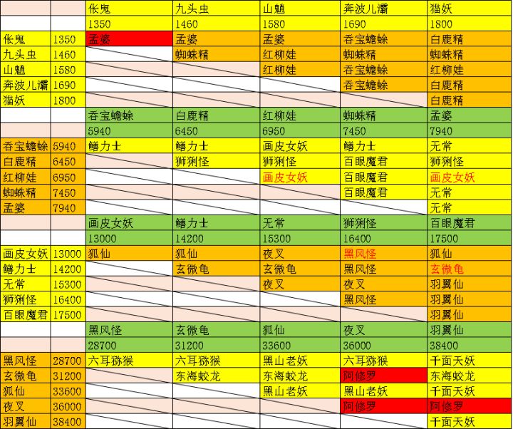 凡兽:软骨兔 240~285伏地玄龟 260~305石臂黑熊 380~425 进化花费3200万 →暗金铁爪熊 53000~62000黑斑虎 400~445 进化花费47万 →清风虎 6000~9000独角青牛 420~465 进化花费19.9万 →七彩神牛 3200~3800混沌阴阳鸟 1600~2200 进化花费354万 →碧水苍鸾 15000~18000雷鸣鹰 1700