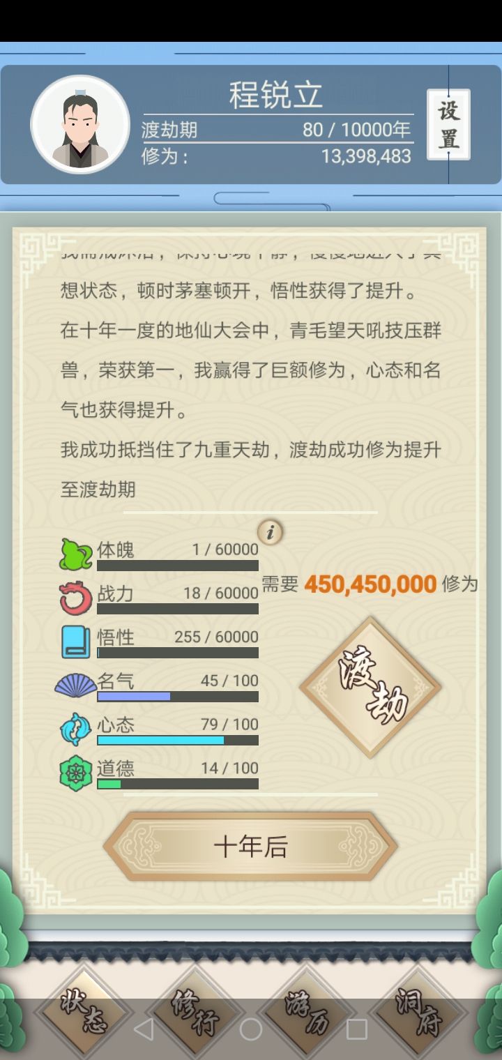 10岁:开100修为礼包QZDF27QW、买道君经、韵灵丹。开始选择题尽量+道德。因为很多事件我们必须做坏人才能利益最大化,为了保持较高道德,有必要开局多一些道德。道德高事件发生几率更高、事件结果更有利。后面无关痛痒的一点点损失都忍了保持道德。失火不要救、母子求救不要救、邪修的药要抢来吃(-体魄也忍了,+修为更重要)。多玩几次就会明白这些事件要怎么选择。总之80%的事件你都选择最邪恶