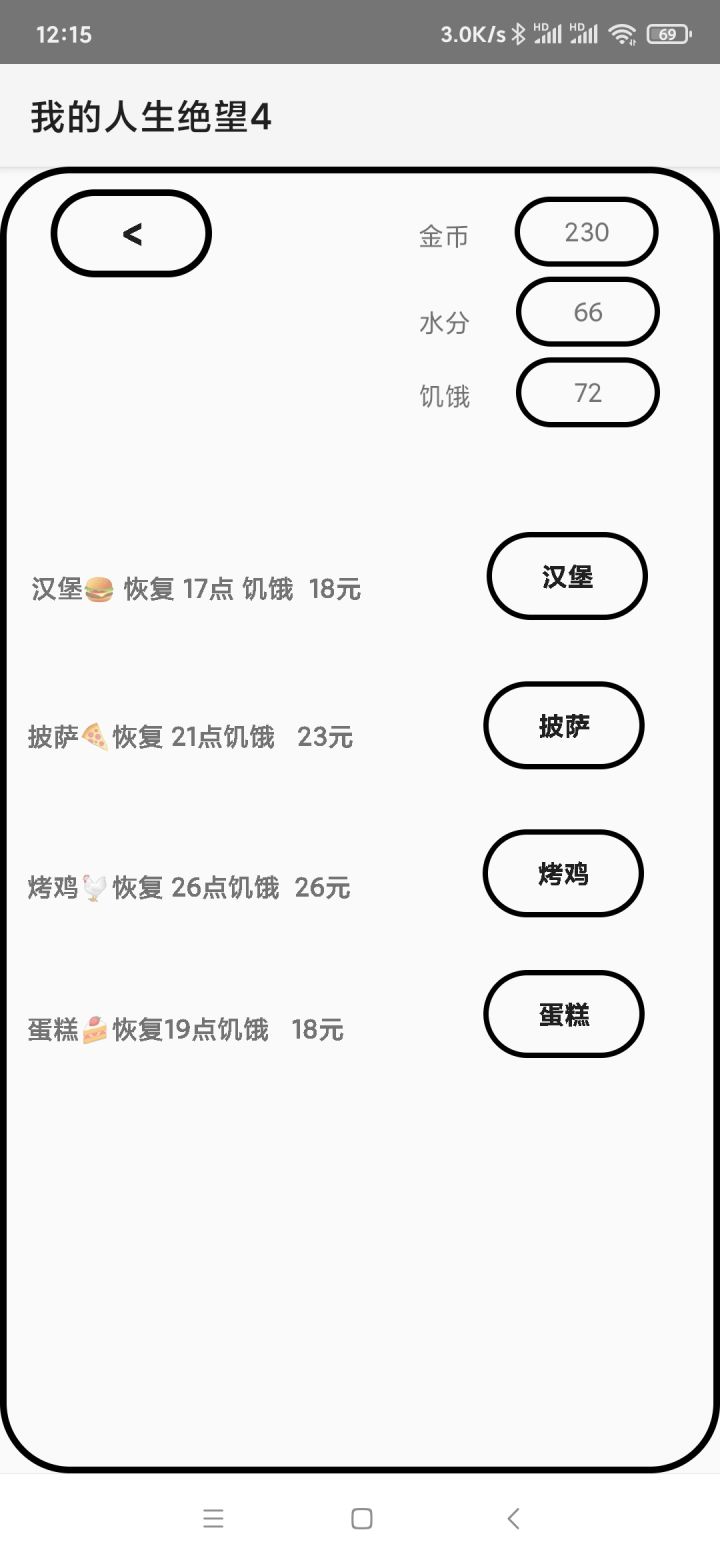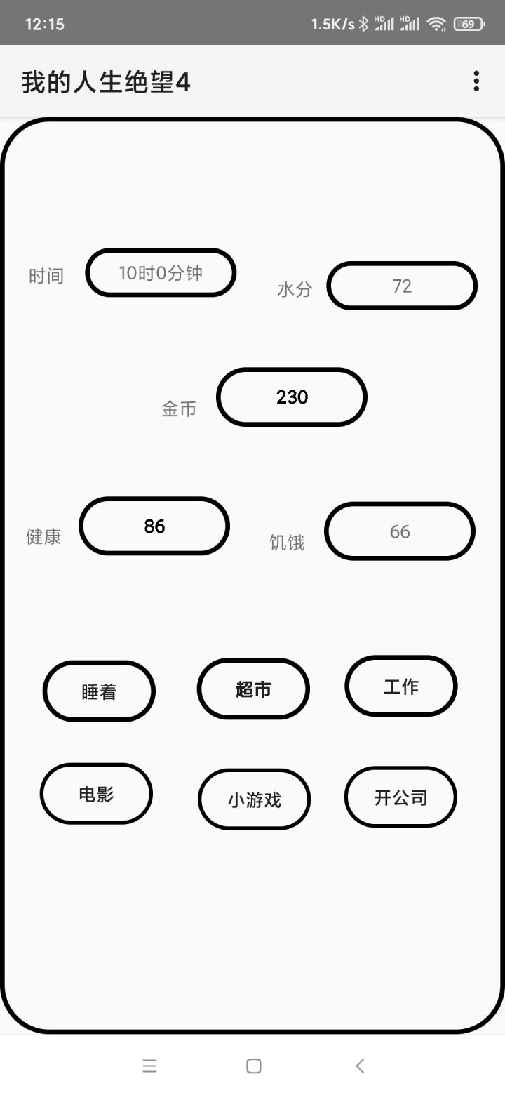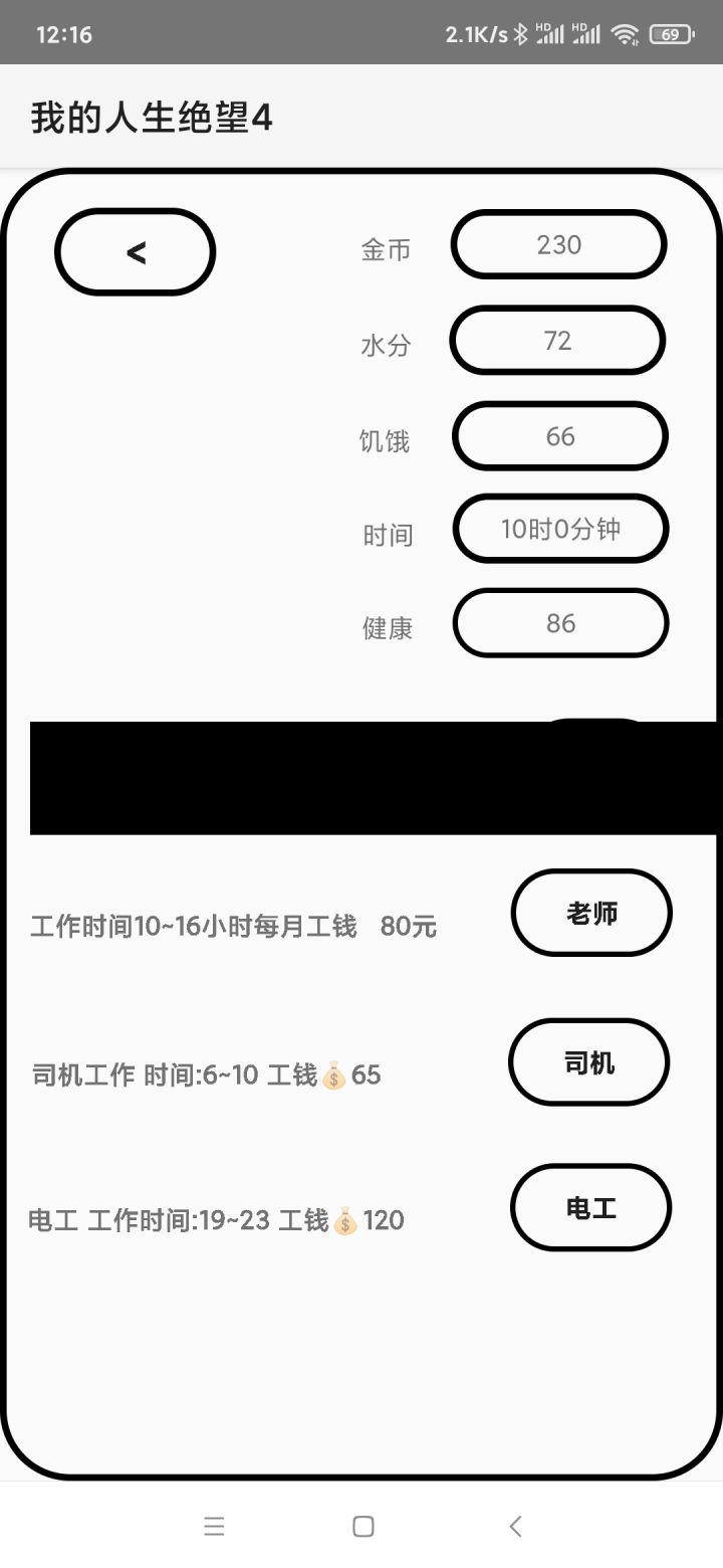 慢慢试哈,太多了,别急。1、数值显示错的,开局去超市买食物,买一次,饥饿就会显示为金币余额。可能是我不是旧版安卓系统的问题。2、设计有问题,睡了很多觉之后,8点,开始工作赚钱,电工非工作时间,因为弹字太慢了,所以点了很多次,哇!直接给我淦到2点,操作和字幕提示完全脱节,这一点导致根本没有游戏体验。3、数据睡觉一小时-9水分-11食物+18健康。工作A三小时80元,时薪26.7;工作B2小