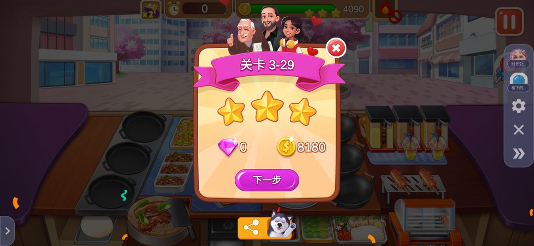 肉夹馍:3-29关 70S 2000+加双倍道具(道具:80钻/个)+广告(结算面双倍)至高8000+、比2K钻换6W金币划算~ 3-29肉夹馍技巧:左边只需要做带小菜的肉夹馍,右边可以放盘子三份炒饭+锅上三份炒饭(一直做就可以) 完成每日任务、两个任务可激活大礼包、如果钻石不够可以刷挑战赛(无上限、有体力可以一直刷、一把挑战成功+20,每四把成功通关可开一个礼包[需看广告、可有几率出15分钟无限