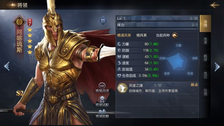 在征霸前两个赛季中,并没有真正意义上的“前排”将领,唯一带有稳定减伤的亚历山大更多被当作输出使用,而恺撒提供的群体防御实际减伤效果也不明显,相信阿喀琉斯的加入,能让大家明白什么叫做真正的前排!【将领解析】阿喀琉斯的面板非常强悍,高达2.75的防御成长足够称为征霸第一坦克,与其他前排类将领不同的是,阿喀琉斯还拥有非常出色的速度成长和力量成长。在担任前排的同时还可搭配一些控场类技能为队伍提供优势。