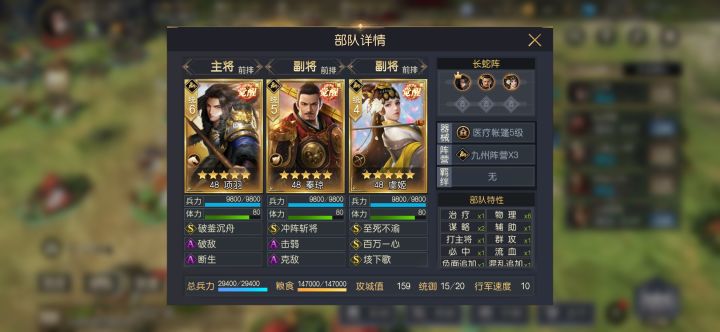 这游戏前期提升势力还是比较简单的,至少2000势力值的目标可以轻松达到。这里就给大家分享一些我自己总结的经验:刚进游戏先配阵容,先上2个相对较强的将领(不够可以抽一下),补满兵直接打2级地(无压力),这里注意不要去浪费体力打1级地,优先养一队主力,打2打3,练到10级之后学A级技能,直接开4,战损高的话继续开3,然后升级技能等级,战损低可以直接开4凑势力,25块四级地就够2000,虽然出生点没这