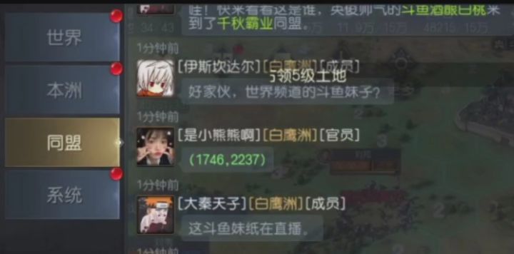 出!大!事!了!到底有多大?大概这么大~(试图用手比划中)就在昨晚,不知哪位君主在世界频道说了一句“有美女在斗鱼直播征霸”,瞬间这个话题就在世界频道炸开了锅,直接成为了当天最热话题,同时不断有人第一时间发回探班报道。征霸霸看到消息也第一时间赶往了现场,其直播间热闹程度堪称《征服与霸业》开服以来之最,基本画面是这样的:甚至有一些知名主播粉丝当场倒戈转粉,并在群内热议如何才能吸引将美女吸引入