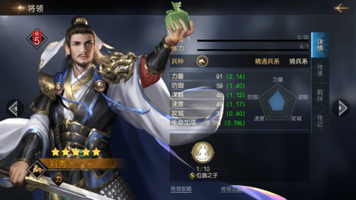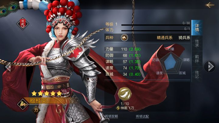 穆桂英属于九州阵营,初始兵种为骑兵系。对于前期缺少高级将领的小伙伴们来说,用好穆桂英十分关键,能够让我们更快地提升自己的势力,下面就为大家详细分析穆桂英这个将领。【属性分析】穆桂英作为骑兵系的一员,具体属性为:力量110(2.59)、防御68(1.61)、谋略57(1.35)、速度74(1.73)、攻城34(0.4)。可以看出,穆桂英是一位力量型的物理攻击将领,这里推荐小伙伴们加点时主加力量,