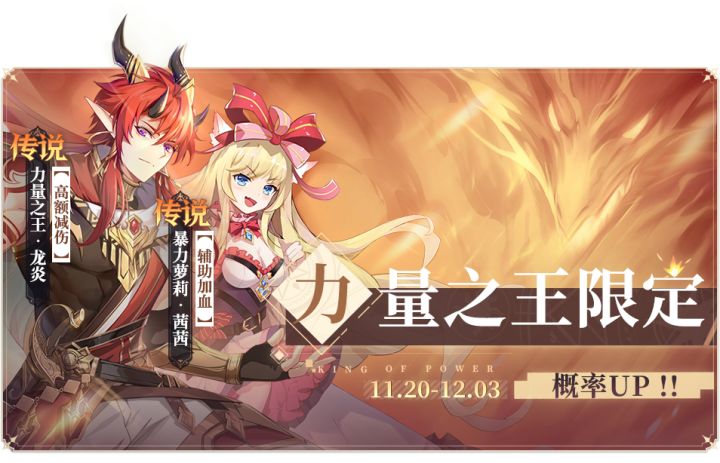 ①11月20日0点更新结束后,将上线“力量巅峰”限定召唤,召唤新增传说精灵“力量之王·龙炎”、“暴力萝莉·茜茜”,且获得概率提升: