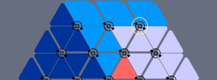你好,我是羊毛,这个帖子里我会教你一些游戏技巧一.操作方法熟练每次点击节点旋转其实是旋转此节点所接触的六个三角(即以节点为中心的正六边形)二.实战技巧1.在边缘的3-3的正六边形只需要转动正六边形节点即可还原2.遇到两个穿插类型的大三角,在其中找到3-3结构的正六边形并旋转节点即可还原3.遇到此类情况,可以先旋转右边的正六边形,把深色的小三角归到同一个正六边形上,然后形成3-3结