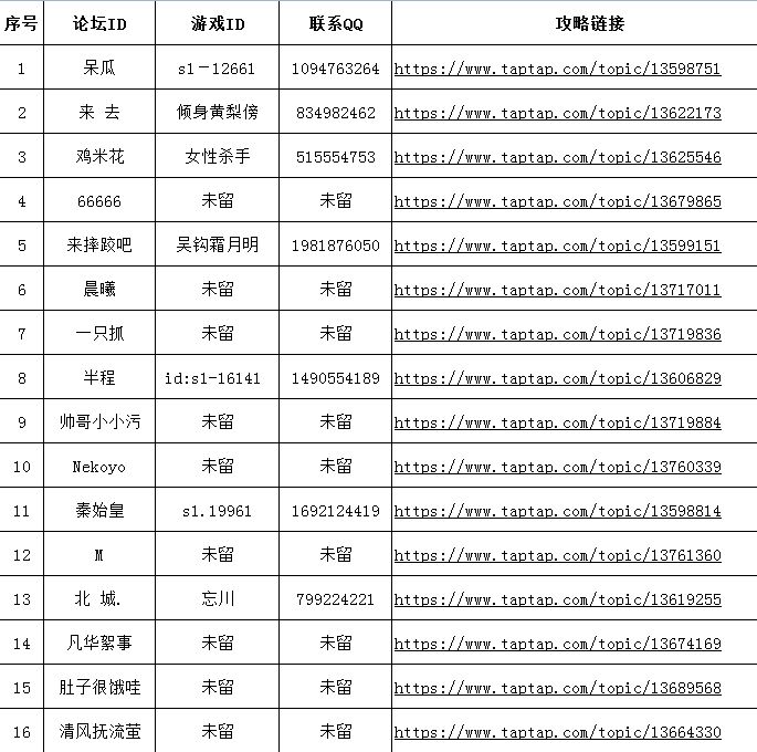 【获奖名单】截止活动结束时间7月17日18:00,有效参与活动的玩家有16位,部分玩家未留下联系方式,勇者大人看到名单后可与我们联系。【兑奖说明】请获奖名单内的勇者大人用帖子内留下的QQ联系我们的小伙伴领队阿豆(QQ:478755751)提供实物邮寄地址,获奖未留联系方式的勇者大人可通过QQ联系后提供您在TapTap上账号登录的截图以确认身份信息,统计完成后奖品会在3~7个工作日之内寄出!ヽ