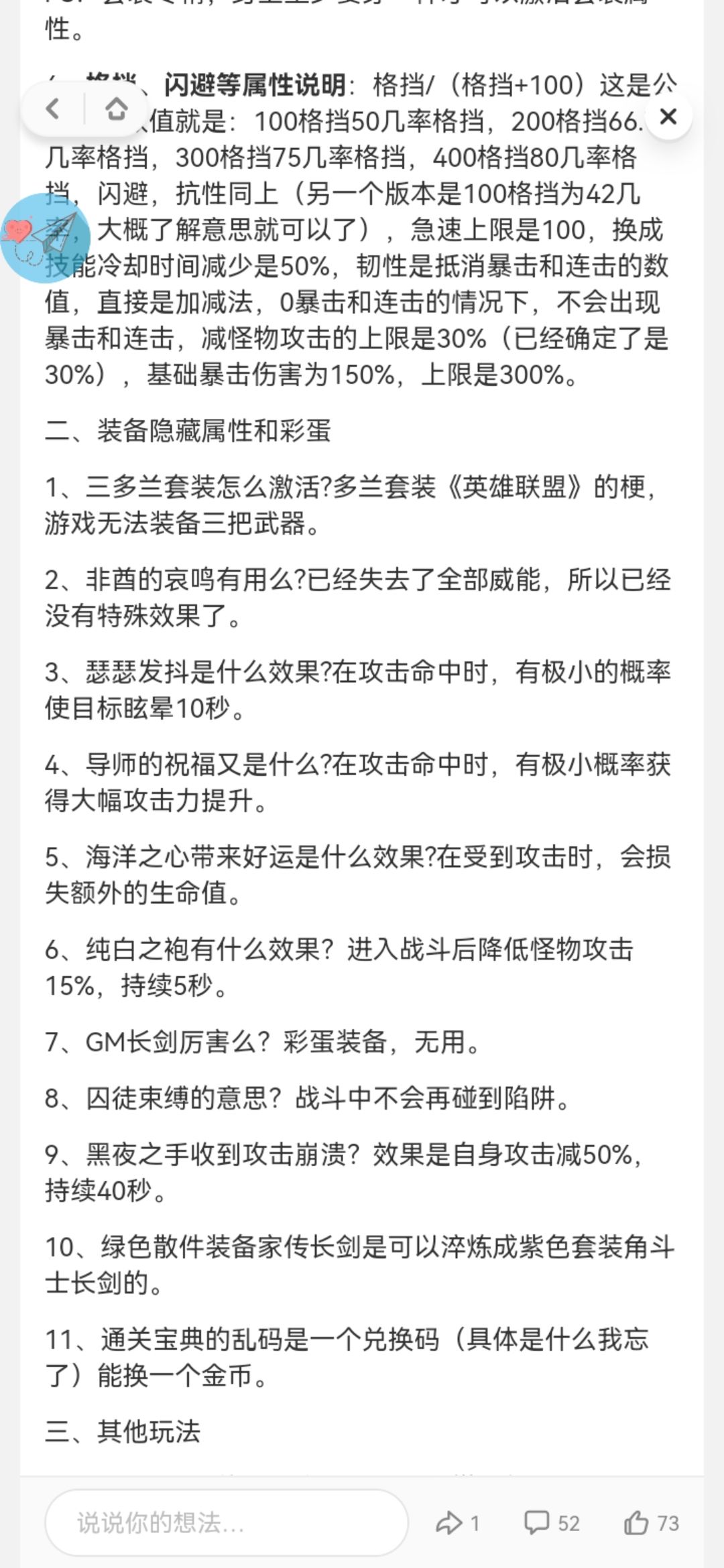 装备栏有八个格子,但装备分为长剑、法杖、匕首、盾牌、法器、头盔、项链、胸甲、手套、戒指、鞋子十类。(ps:这些可以在图鉴里查看)。 装备品质分为普通、优秀、精良、史诗、传说,等级为1、10、20、30、40、50。(目前只出到50级)且只有相同品质和相同等级的才能合成。 关于合成公式,暂时只发现如下: 1、套装+套装=套装(ps:不要求是相同套装的装备,套装背景带光环、胸甲因为贴图原因可能看不到)
