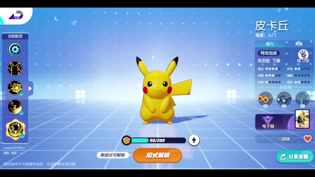 新手重点来了——宝可梦的类型 在大集结中,宝可梦各有不同的特色,因为移除了属性克制,将其归类为攻击型、敏捷型、平衡型、防御型、辅助型。 每一只宝可梦的根据平A攻击距离的不同,有近距离、中距离和远距离的区分, 按照操作难度的不同:分为入门、中阶和高阶。 对于新人玩家比较友好的宝可梦,此处作一个简单推荐: 攻击型宝可梦——皮卡丘,闪焰王牌 举例皮卡丘:新手单排,战斗中灵活,远程活力足,骚扰敌人,偷取野