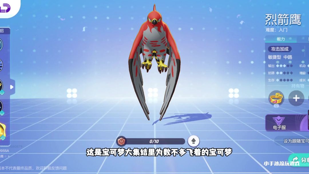 #宝可梦大集结图文创作大赛 #宝可梦大集结攻略 我看贴吧这个英雄讨论度不高,出个攻略 烈箭鹰属于敏捷性 推荐中路 上手难度低 普攻第三次攻击会造成%140可以在设置里-对战信息 打开强化普通攻击显示 抓人前可以A空气攒个被动, 烈箭鹰 被动 血条高于%60时 提升%10移速 简单易懂 1技能 蓄能焰袭有两段位移 可以空放使用后强化普攻 两段释放完放后才会进入CD 使用时穿插个普通就好