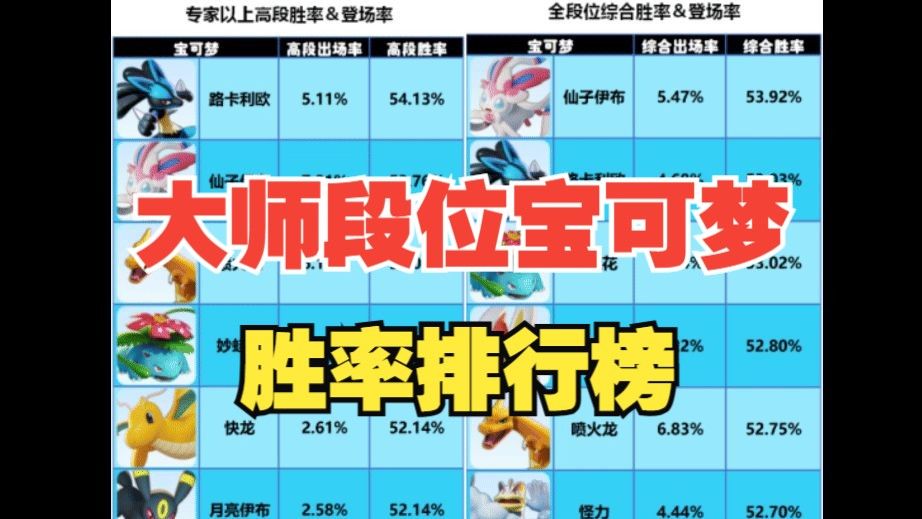 专家以上高段位宝可梦胜率排行榜,高段位皮卡丘登场率惊人!