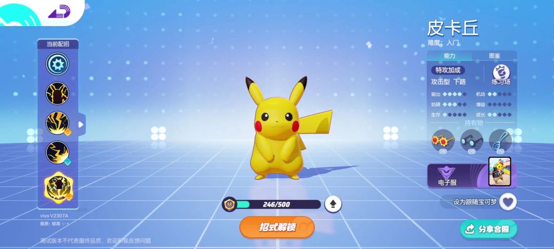 皮卡丘:能点杀和群体终结的炮台法师 (满级550特攻) 对战bug道具:力量强化(强化基础双攻至120%) (配合增伤科技更加逆天) 持有物:回血类>移速类≥攻击类 (以上是我个人权衡,你们看情况自己选吧) 这里?轻石、贝壳之铃、讲究眼镜 注:皮卡丘1技能有个增伤要移动速度够高,所以一定要带轻石! 技能:1技能[电球-提升强化],2技能[十万伏特-追加伤害],3技能[增加锁定数量] 注:1、2技能