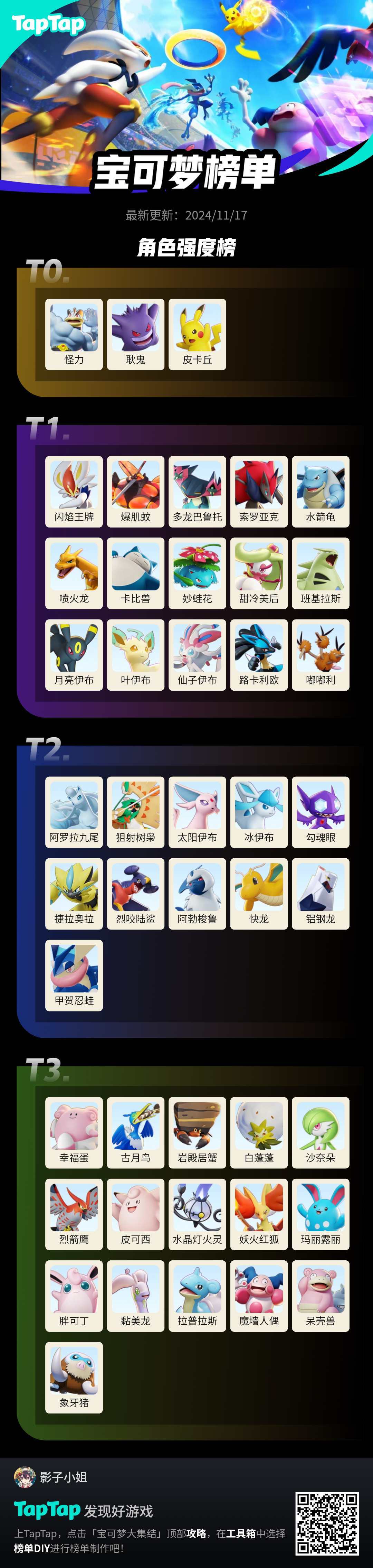 #宝可梦大集结榜单 这个榜单是个人主观感受。并不能代表官方实际,你要是杠,那就是呢对[表情_微笑]。 T0三巨头之皮卡丘,不愧是主角光环,新手不知道练什么练皮卡丘就完了,免费送不说,技能无脑连就完了,让你体验血条消失术的快乐[表情_尬笑],懂不懂一个电球半管血没了的的含金量[表情_坏笑],高贵的技能全锁头机制,哼,想逃?闪电旋风劈!看我电球劈不辟死你就完事了,头套都给你劈下来[表情_坏笑],我们皮