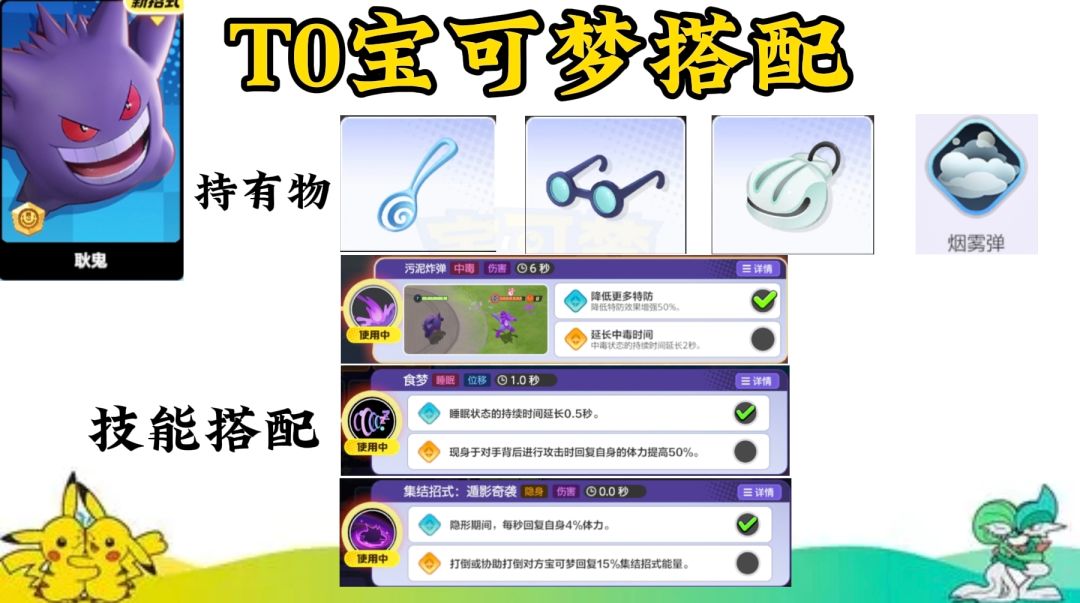 耿鬼,怪力,仙子伊布,索罗亚克,皮卡丘,闪焰王牌持有物,技能推荐(个人推荐) 耿鬼:这一套个人感觉默认的这三个就很好用,一定要带铃铛,如果没有铃铛就带吃剩的东西加血。 怪力:个人感觉深渊翻滚是必选技能,一技能两个都差不多。 仙子伊布:主要就是减速回血拉扯能力强,铃铛也很重要。 索罗亚克:手法不好的不要买这个宝可梦,很多人连最基本的技能都不会放,二技能选择『出奇一击』难度要低很多了。 皮卡丘:个人比