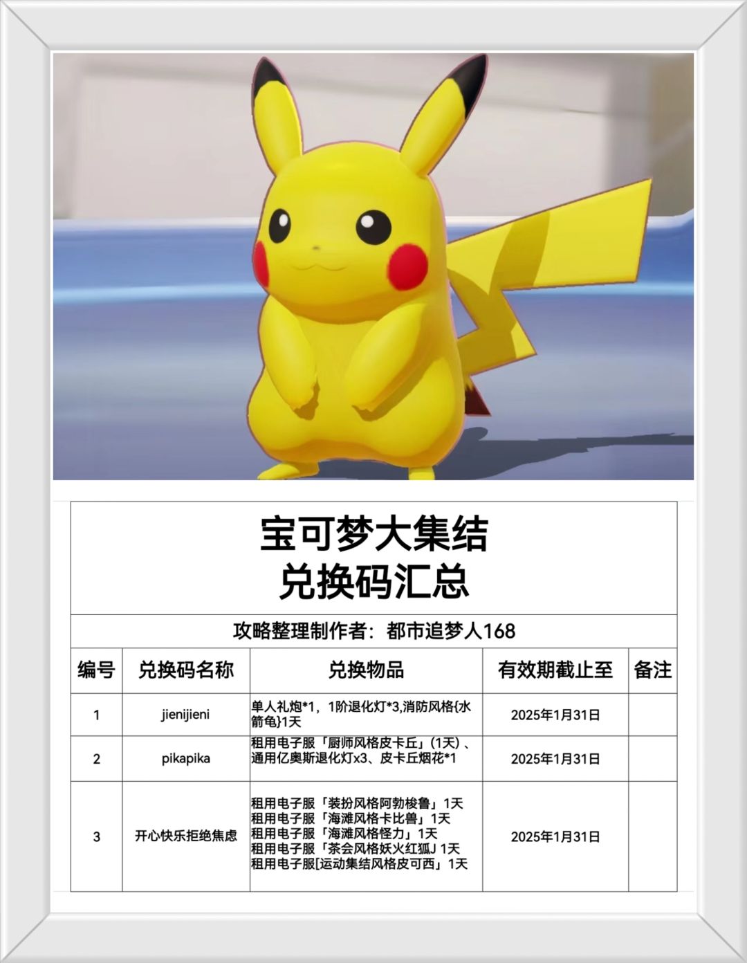 兑换码名称 兑换物品 1:jienijieni 单人礼炮*1, 1阶退化灯*3,消防风格{水箭龟}1天 2:pikapika 租用电子服「厨师风格皮卡丘」(1天)+其它物品 3:开心快乐拒绝焦虑 精良电子服随机盒(1天) 4:兑换方法:等游戏7级后在游戏主界面右上角点击 - 活动 - 日常 - 礼包码兑换 - 输入对应的兑换码即可。 攻略整理制作者:都市追梦人168 #宝可梦大集结 #宝可梦大集