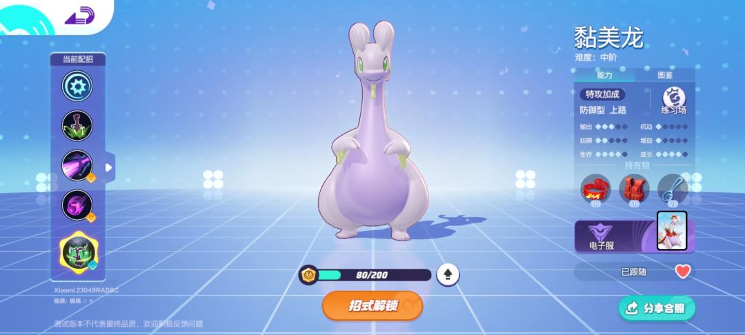 战绩展示: 黏美龙为防御型(特攻加成)宝可梦,分路为上路,在输出、妨碍、生存方面都有一定能力。其中生存>输出>妨碍。 这次先介绍一下特性: 收到伤害时会有概率向周围释放黏滑效果,被施加该效果的对方宝可梦会降低攻速和%8移速,其中移速可以叠加4层,最高叠加到32%。 若黏美龙处于草丛中时会恢复少量体力,若在恢复时离开草丛恢复效果会小时,结束后会有一段时间恢复,恢复后可再次触发! 然后是