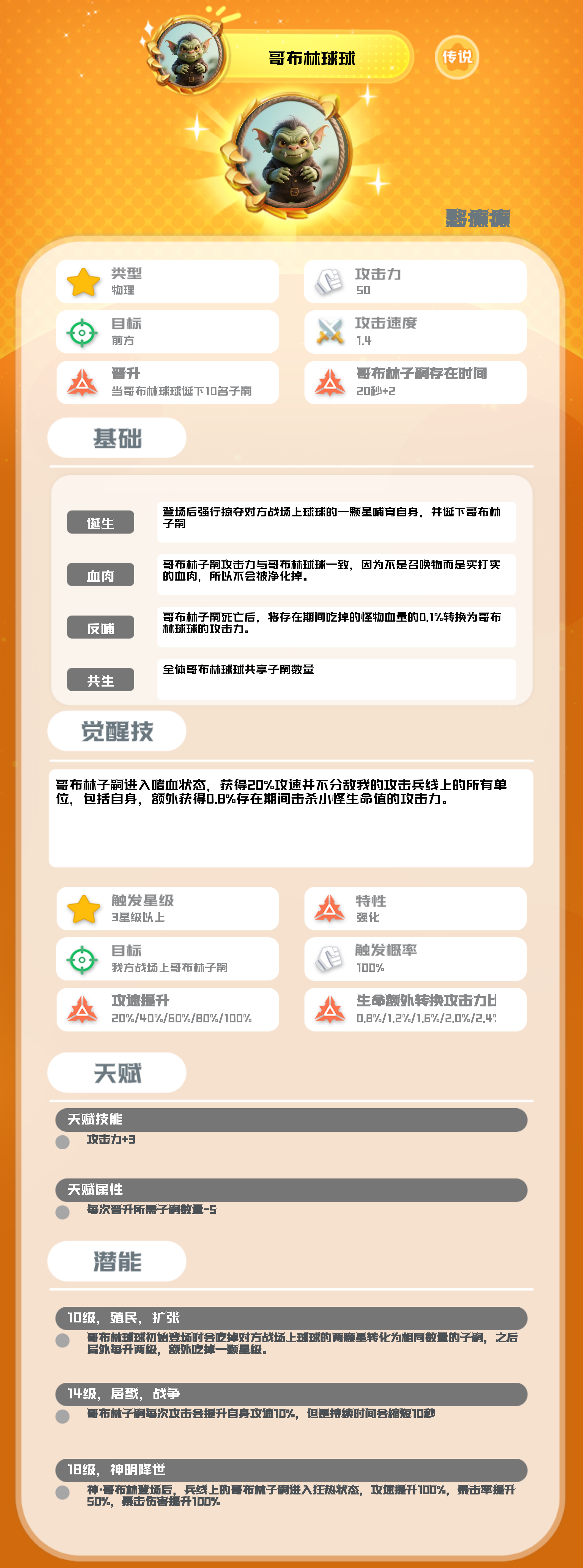 丹宝球球 定位,辅助 攻击- 攻速- 类型 增益,减益 技能 丹宝球球出现/每隔45秒开炉炼丹,会随机练出12种丹药的一颗,炼丹间隔随丹宝球球总星级递减,最多减少至15秒,局外升级额外减少1秒,丹药仅对服用的单位永久有效,相同丹药不叠加,不同种类丹药可叠加 强体丹,我方球球会增加攻击20%+3% 弱化丹,敌方球球会减少攻击20%+3% 敏行丹,敌方战场上的小怪会增加移速20%+3% 潜能丹,我方球