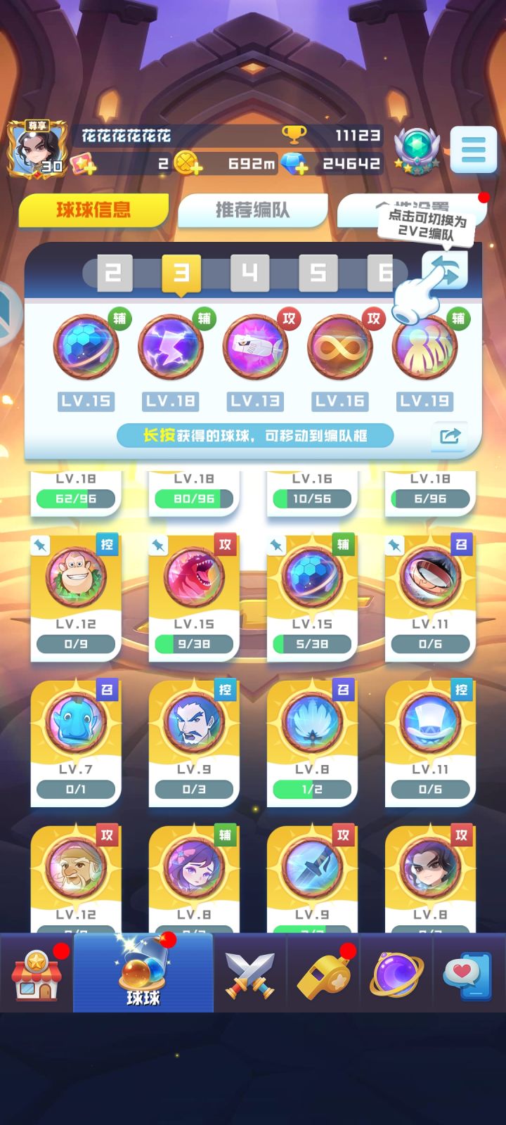 回归抽奖,限定球差不多就我拍的这三排,剩下的都是老球,我的阵容和球在剩下的图里,不充钱的话能有200抽,可以抽两个球,大佬们如果觉得补魔王比较好,我就用票子额外买120抽,升11魔王,因为我感觉我现在的阵容即便用7级卧龙还是有点吃力,有的时候就是打不过对面,欢迎大佬们说说自己的建议