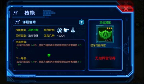 小伙伴们,这里是大型科幻策略手游《星际要塞》。新资料片《星历伊始》已于8月3日重磅更新,并且为我们带来了全新的幻影指挥官和EX技。目前在《星际要塞》掀起一阵关于EX技的巨浪,大家都在讨论关于这个技能到底怎么样,今天为大家带来最权威的EX技能与一般技能的对比供大家参考!【战略技能-敌方】首先我们以技能类型为战略技能攻击敌方的“攻击减压”为例,同样是LV1的技能,EX技爆发为六星是普通模式三星技能