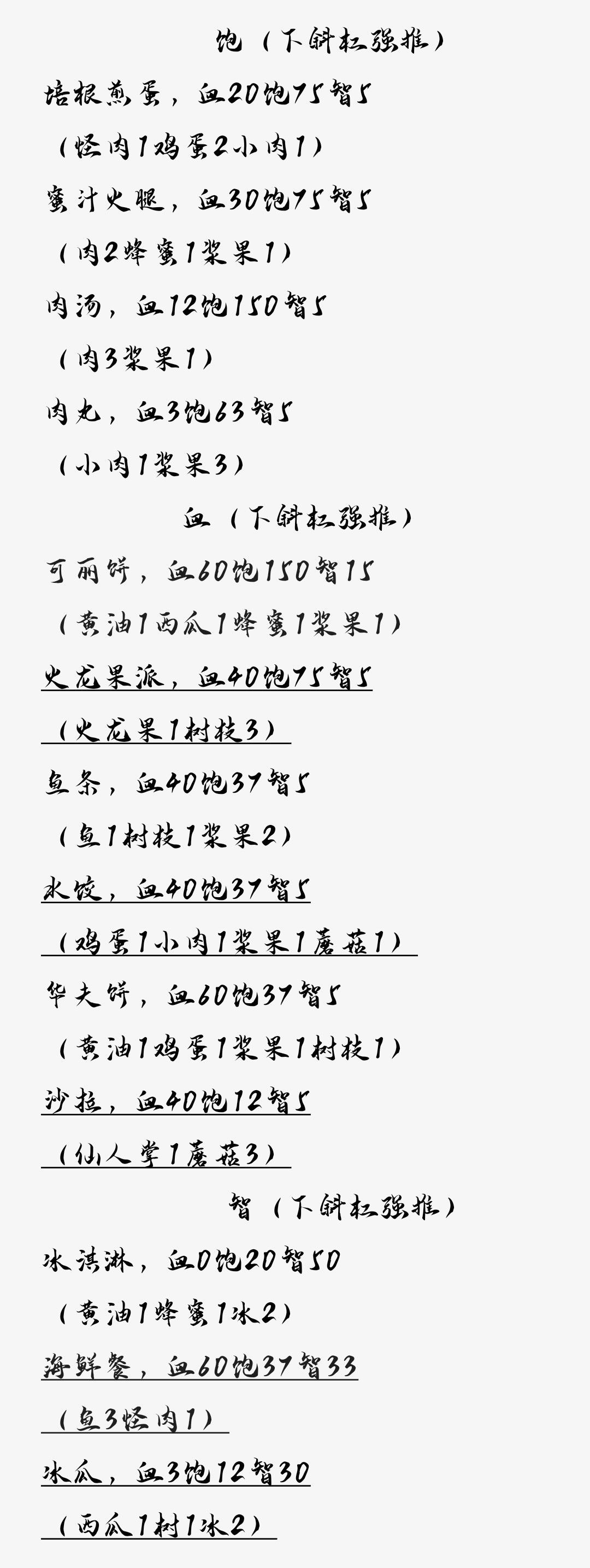 这里转发个菜单给那些新基友,里面标注了菜品作用,和最低制作成本,