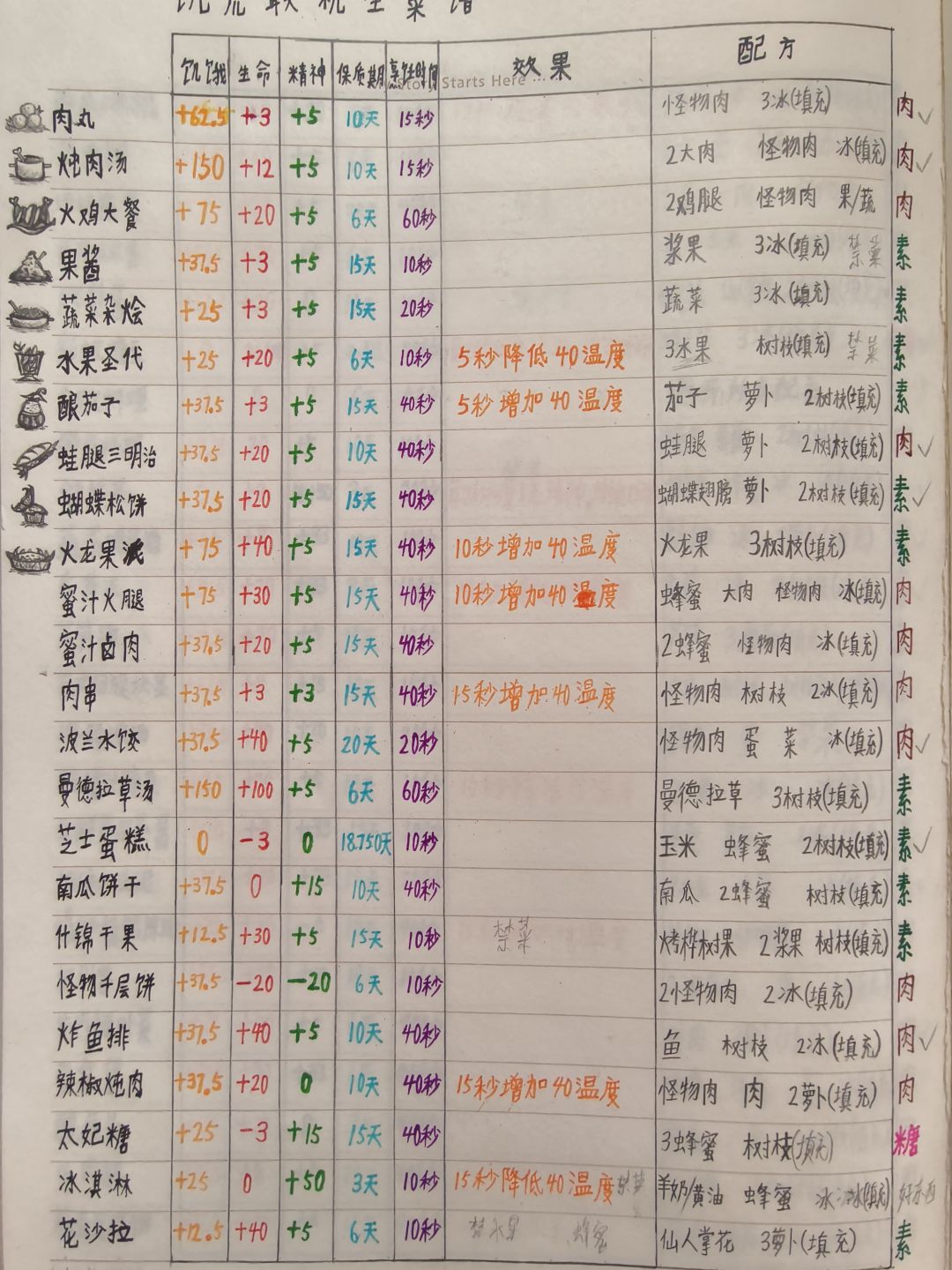 一切按最省食材烹饪 【填充】一般冰块,其次浆果,除非标明可以用蘑菇或树枝 打√,是个人推荐,食材获取程度,三维回复效果,保质期及烹饪时间等,性价比综合考虑