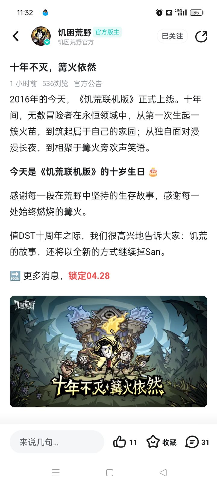 2016年的今天,《饥荒联机版》正式上线。十年间,无数冒险者在永恒领域中,从第一次生起一簇火苗,到筑起属于自己的家园;从独自面对漫漫长夜,到相聚于篝火旁欢声笑语。今天是《饥荒联机版》的十岁生日 🎂感谢每一段在荒野中坚持的生存故事,感谢每一处始终燃烧的篝火。值DST十周年之际,我们很高兴地告诉大家:饥荒的故事,还将以全新的方式继续掉San。🔜 更多消息,锁定04.28