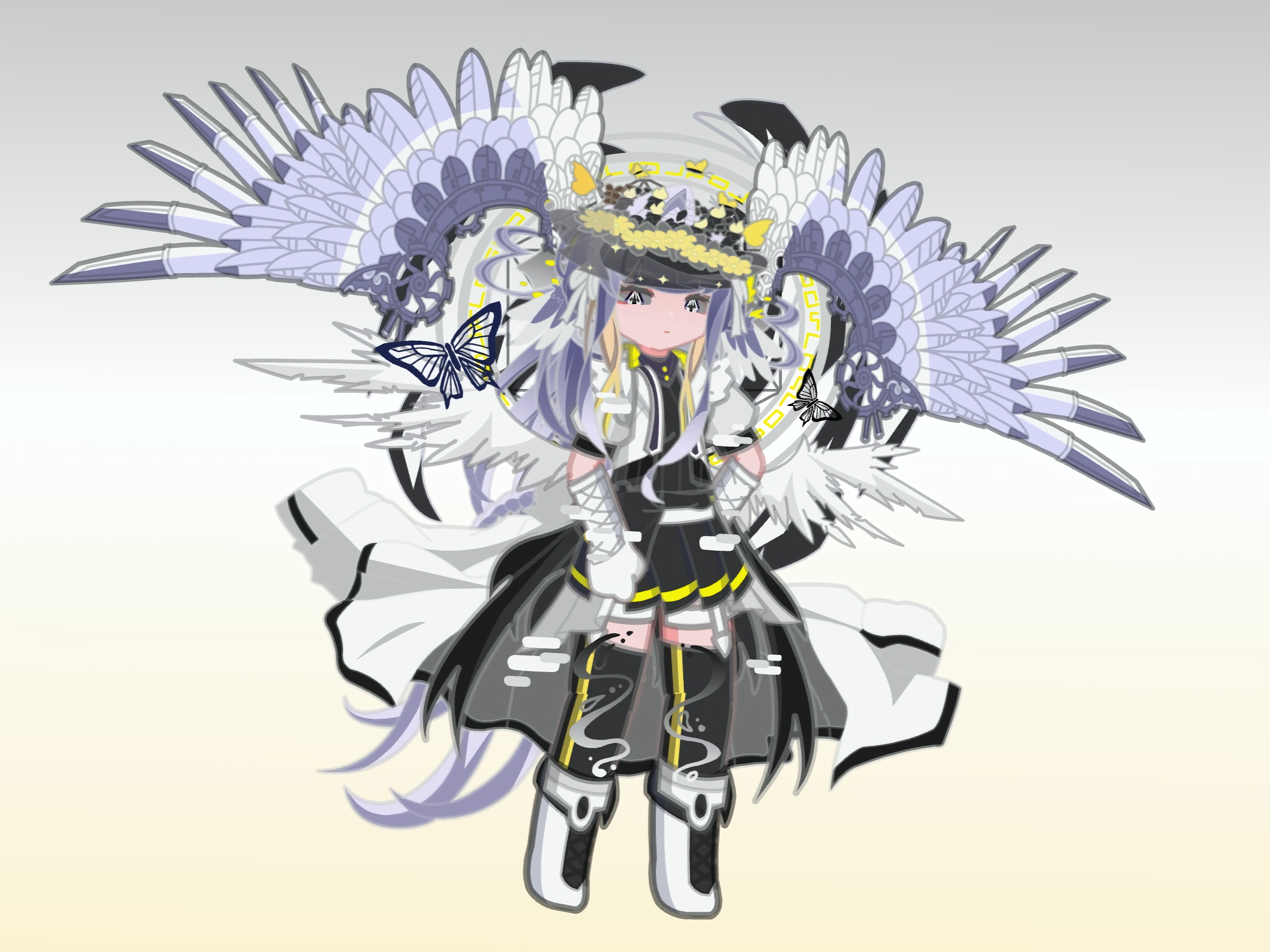 加百列:耳饰是友人送的(有友人的红棕色和自己的银灰色),外套是友人的红棕色、米迦勒的暖黄色和自己的银灰色,身上有很多绷带(以前的旧伤,仔细看的话肩膀上还有一处露出来的伤痕)。蒙眼是我的一点儿XP,意义是遮住眼神里的混乱(眼睛的颜色是:友人的红棕色),还有的意义是让人注意不到祂在盯着你(类似于异形那样不盯着你看,却非常有压迫感的那种?)。米迦勒:腰间的配饰、项链和耳饰是友人的遗物(自己的暖黄色和友