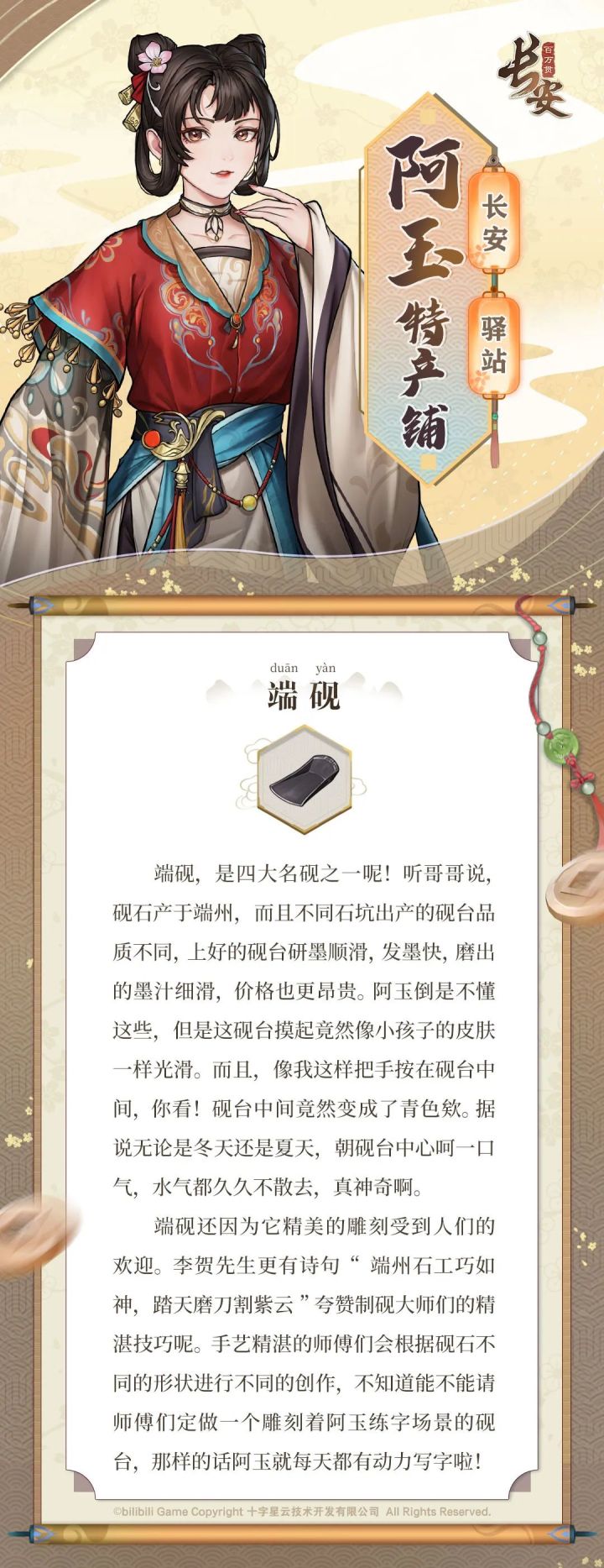 小东家们来啦,请稍等一下哦,等阿玉写完这个字就来招呼大家。啊?为什么突然开始练字啊,因为哥哥说阿玉的字不好看,要阿玉多多练习,哥哥还特意从端州带回来了上好的端砚让阿玉练习呢。既然小东家们到了,阿玉也趁机偷懒一下下吧,正好给大家介绍一下这名贵的【端砚】端砚,是四大名砚之一呢!听哥哥说,砚石产于端州,而且不同石坑出产的砚台品质不同,上好的砚台研墨顺滑,发墨快,磨出的墨汁细滑,价格也更昂贵。阿玉倒是不