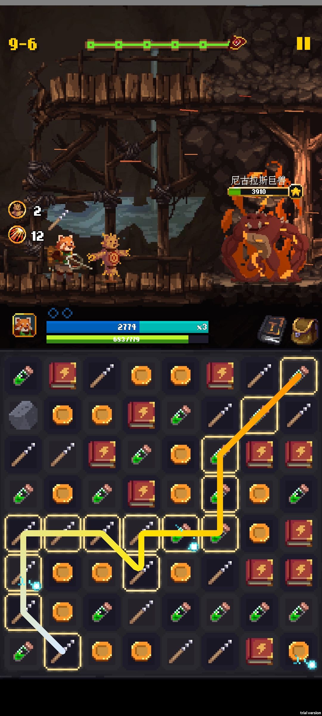 不需要那么复杂,简单的说就是屯闪电,一切以制造6消生产闪电为目标。4消5消反而是需要避免的,影响你出闪电。 什么?异常方块?他们会在闪电爆发中很自然的消失。 其他要注意的的是几个石头怪,提前攒点闪电直接秒了,塞石头非常恶心。 有钱了去商店刷未知项链,有个守护者项链加行动点,比加那点属性实在得多,三个行动点基本一回合一个闪电。 第二个角色弓箭手蜘蛛女王初见过。