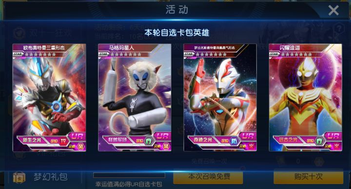 祝福不是鞭炮,响过就完了;祝福不是炉灶,火过了就冷了;祝福不是时髦,过时了就淡了;祝福是无数日子的牵挂凝结成的一句话:奥特祈福又来了~活动一、限时卡包活动时间:11月14日至11月20日21时活动内容:限时卡包第一轮时间为为11月14日-17日,第二轮为11月18日-20日。第一轮卡包奖励:第二轮卡包奖励:活动二、限时召唤活动时间:11月14日至11月20日21时活动内容:以下为本