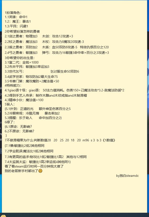 在这个专区了看到了好多攻略帖子,说实话,其实我觉得并不算理想。 按着走的确可以,不过会感觉又肝又累,可能一个存档玩四五天都没什么起色也许还没发满级。 可能那些攻略玩起来是比较能体验多重剧情吧,不过我这个帖子主要是讲求效率的帖子,拒绝一切花里胡哨,想要重点体验剧情的童鞋请绕道了。 首先是开始的几个选择,个人推荐路线是 魔王(加暴击,暴击后期重要) 剑之勇者(蜀山前置其他无所谓,万一你想玩蜀山呢) 武